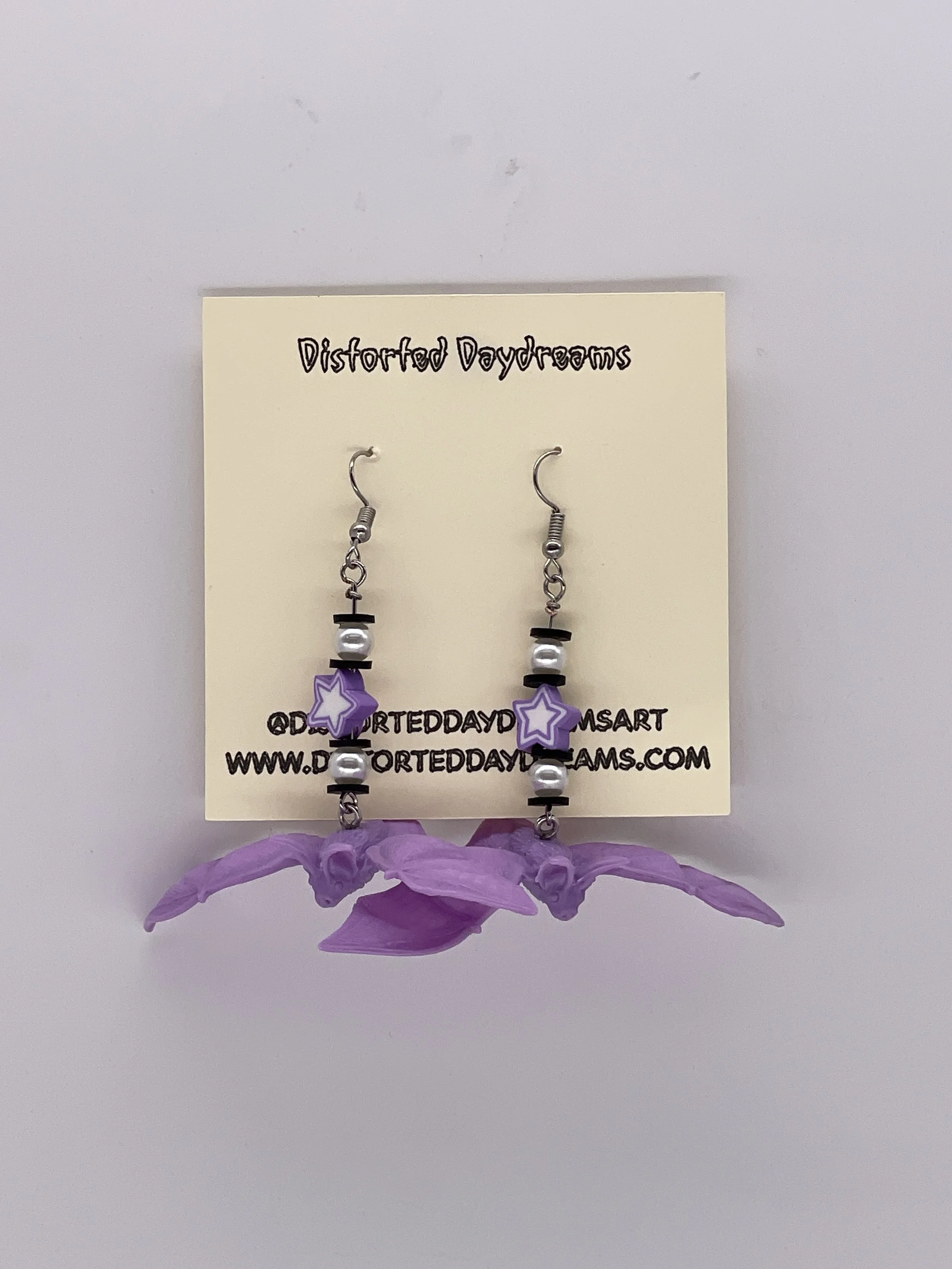 Light weight pastel plastic bats that are beaded and wire wrapped with pearls, black spacer beads, and pastel star beads. Silver metal alloy loop hooks and earrings.